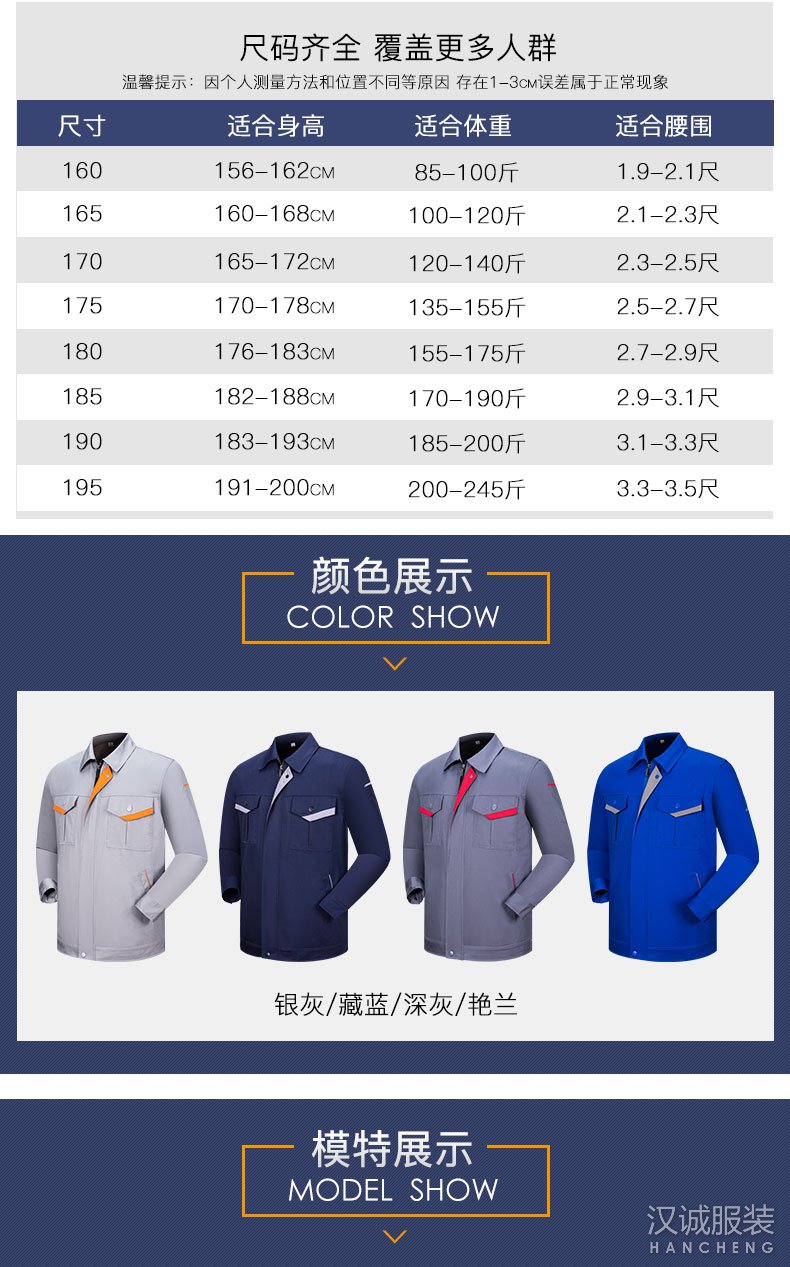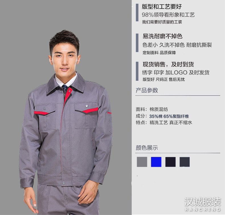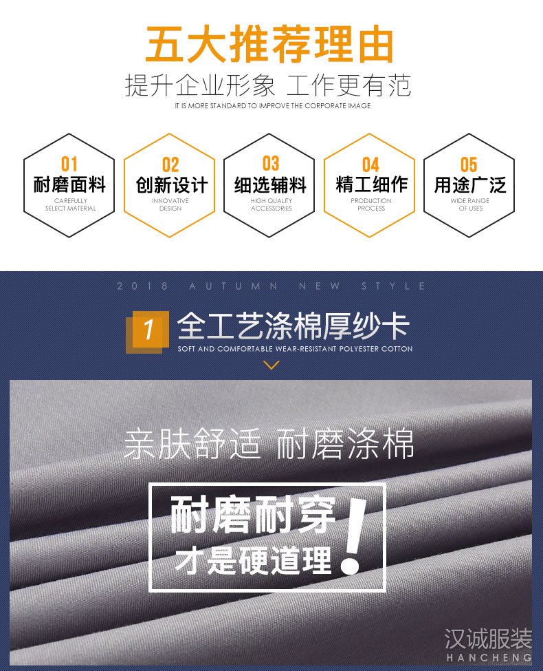 汉诚服装专注于企业工作服定制厂家、免费印LOGO绣字、不限款式和面料、来图来样即可定做,优质的工服定制服务,优质的服装质量,提供企业LOGO印绣,欢迎咨询!面料采用全工艺涤棉纱卡面料,不易褪色,不易起球,透气性强,手感柔和,穿着更舒适。