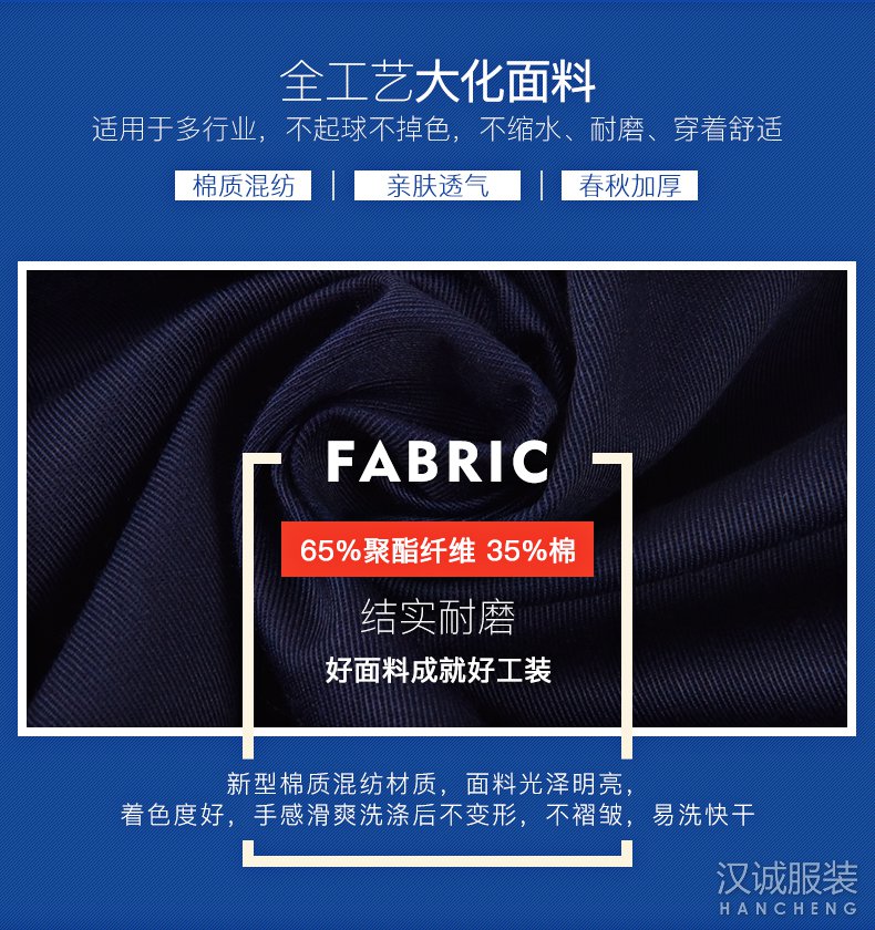 汉诚服装专业从事于工作服定做加工多年,质量保证,价格优惠,免费印绣LOGO,来图来样按需定制,面料可采用,涤棉沙卡、涤棉细斜、纯棉磨毛帆布、纯棉沙卡等面料,面料特性:采用全工艺染色,不易褪色、不易起球。
