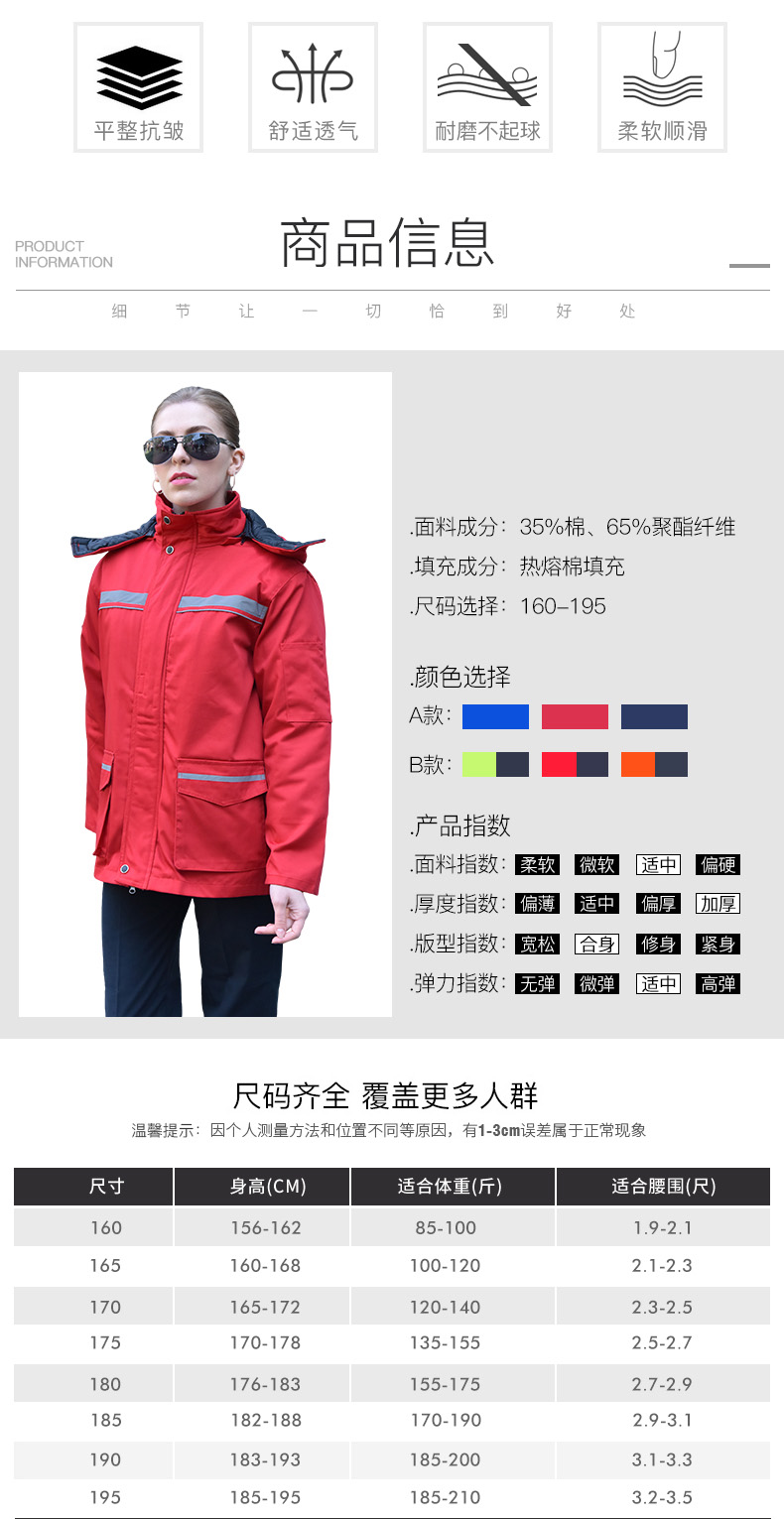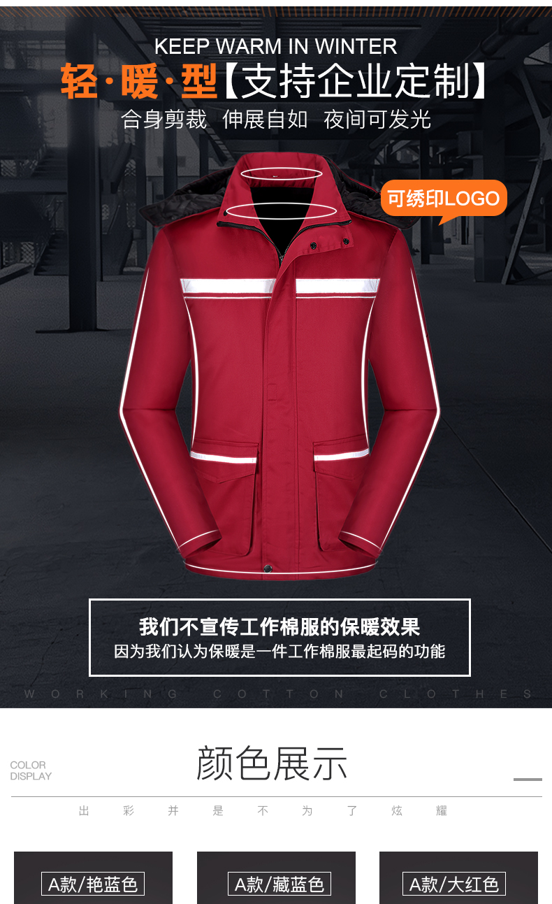 我们可提供来样来图定做,不限款式和面料,免费提供LOGO刺绣等,我们将为您推荐最符合您的企业特色的棉服工作服样式,欢迎您提供更多您的企业信息以便我们给您提供更优质的服务!