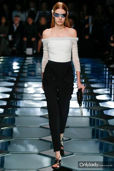 来自Balenciaga 2015系列的这套裤装,露肩针织绉纱上衣,两袖和衣身侧边饰有带褶饰的网布拼接,散发出极致的柔美风情。设计上又配有柔软的胶骨,增添服装结构感。呈现个性对比效果的玻璃串珠缀饰则为造型注入了令人意想不到的迥异材质元素。长裤由羊毛马海毛混纺面料精裁而成,能随着步伐呈现出优雅动感,腰腹部的缎面折叠装饰亦能修饰腰部曲线。