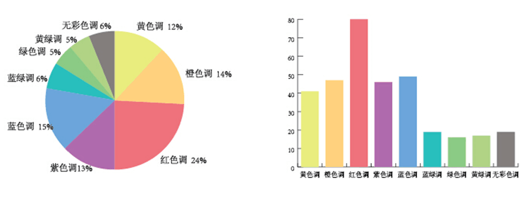 调研数据显示,在全部颜色中,在有彩色系中,红色共出现了80只,占据总比例的24%。居于调研颜色的首位;蓝色系,共计49只,占据总比例的15%,位于总排名的第二位;橙色系出现47只,占据总比例的14%,位于第三位;紫色系出现48只,占据总比例的13%,名列第四位;黄色系出现41只,占据总比例的12%,名列第五位;无彩色系颜色共出现19只,占据总比例的6%,位于此季调研色彩排名榜比例的第六位;青色系出现19只,占据总比例的6%,名列第七位;黄绿色系出现17只,占据总比例的5.1%,位居第八位;绿色系出现16只,占据总比例的4.9%,排名垫底。