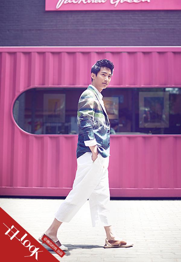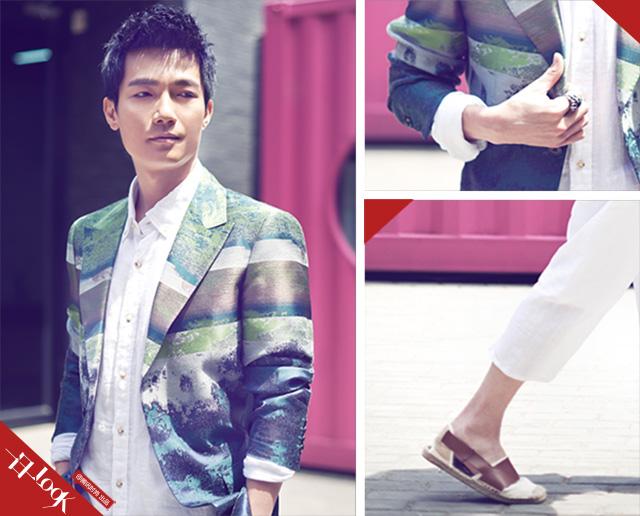 陈楚生给大家带来印花西装的搭配。没有直挺西裤和闪亮皮鞋的标配而是用最朴素的白色麻质衬衫和七分裤与印花西服混搭,让时髦风格也充满了慵懒的气质,脚下皮革拼接的草编鞋与印花西装一样充满了个性,也让整体风格更有不羁的姿态。这样随便的潮味才适合夏季的穿搭,再配合一些古朴个性的配饰就更酷了。